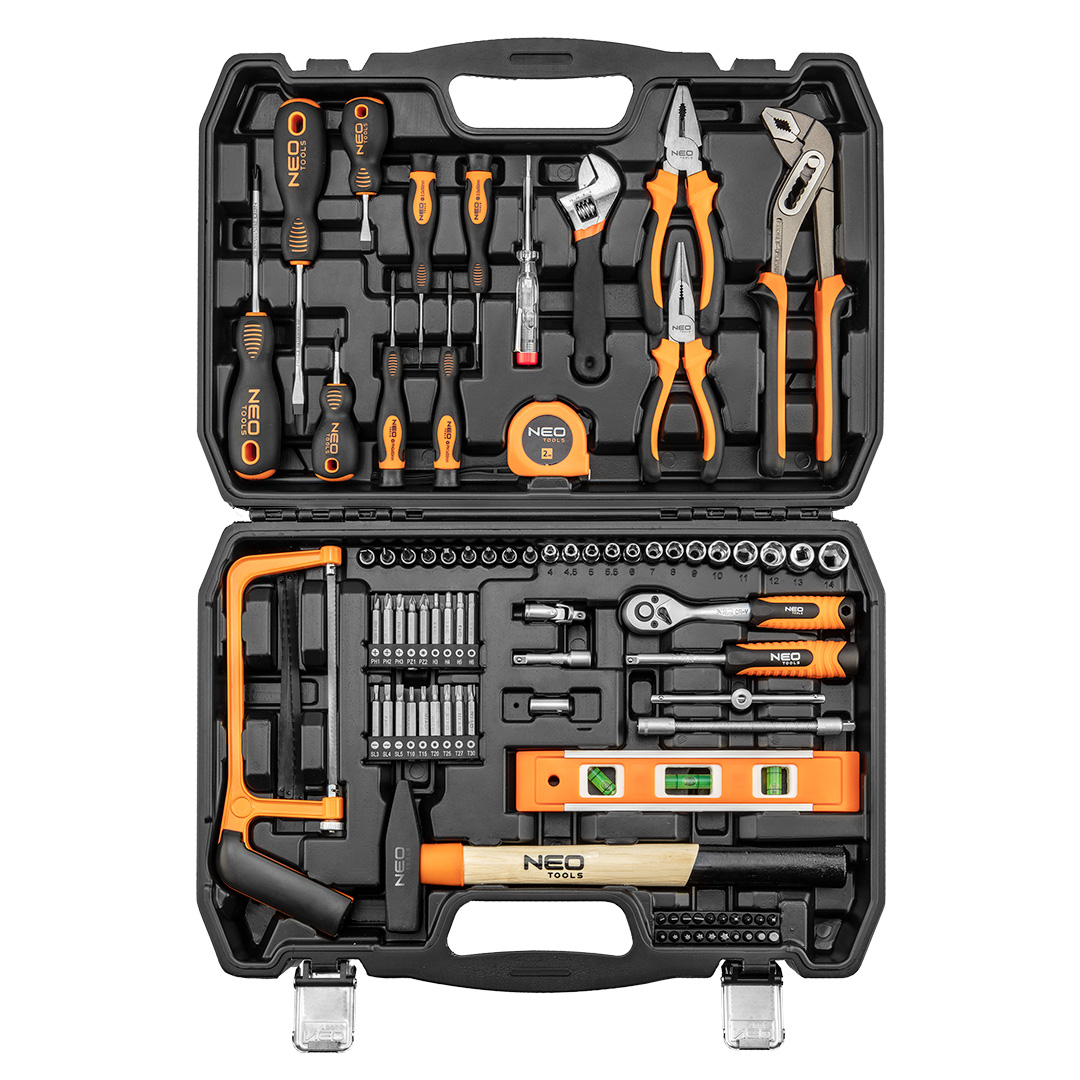 Zestaw narzędzi 88 elementów 10-202 NEO składa się z 88 elementów, wykonanych z wysokiej jakości stali chromowo-wanadowej. W skład zestawu wchodzi grzechotka 1/4″ wyposażona w trwały mechanizm zapadkowy (72 zęby) i ergonomiczny uchwyt. Zestaw zawiera m.in. pakiet nasadek 1/4” (w rozmiarach od 4 do 14 mm) i końcówek wkrętakowych 1/4” (płaskie, krzyżowe, sześciokątne, Torx). Uzupełnieniem są: klucz nastawny, poziomnica, miarka zwijana 2m, uchwyt wkrętakowy do nasadek, młotek, szczypce uniwersalne, płaskie i do rur, próbnik, 4 wkrętaki oraz 4 wkrętaki precyzyjne. Całość jest dostarczona w praktycznej i solidnej walizce z tworzywa sztucznego. Niezawodność produktu potwierdza 25-letnia gwarancja.