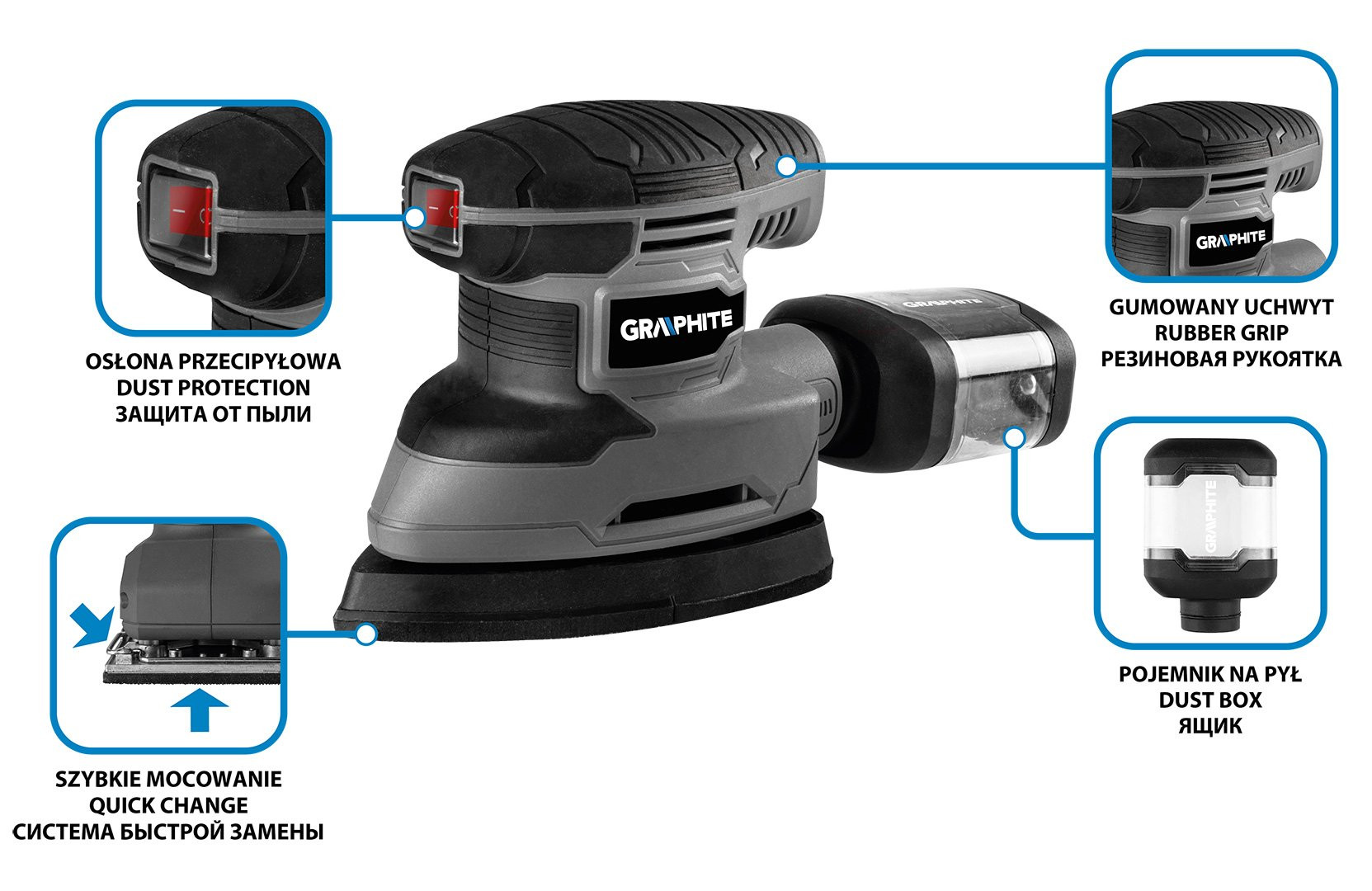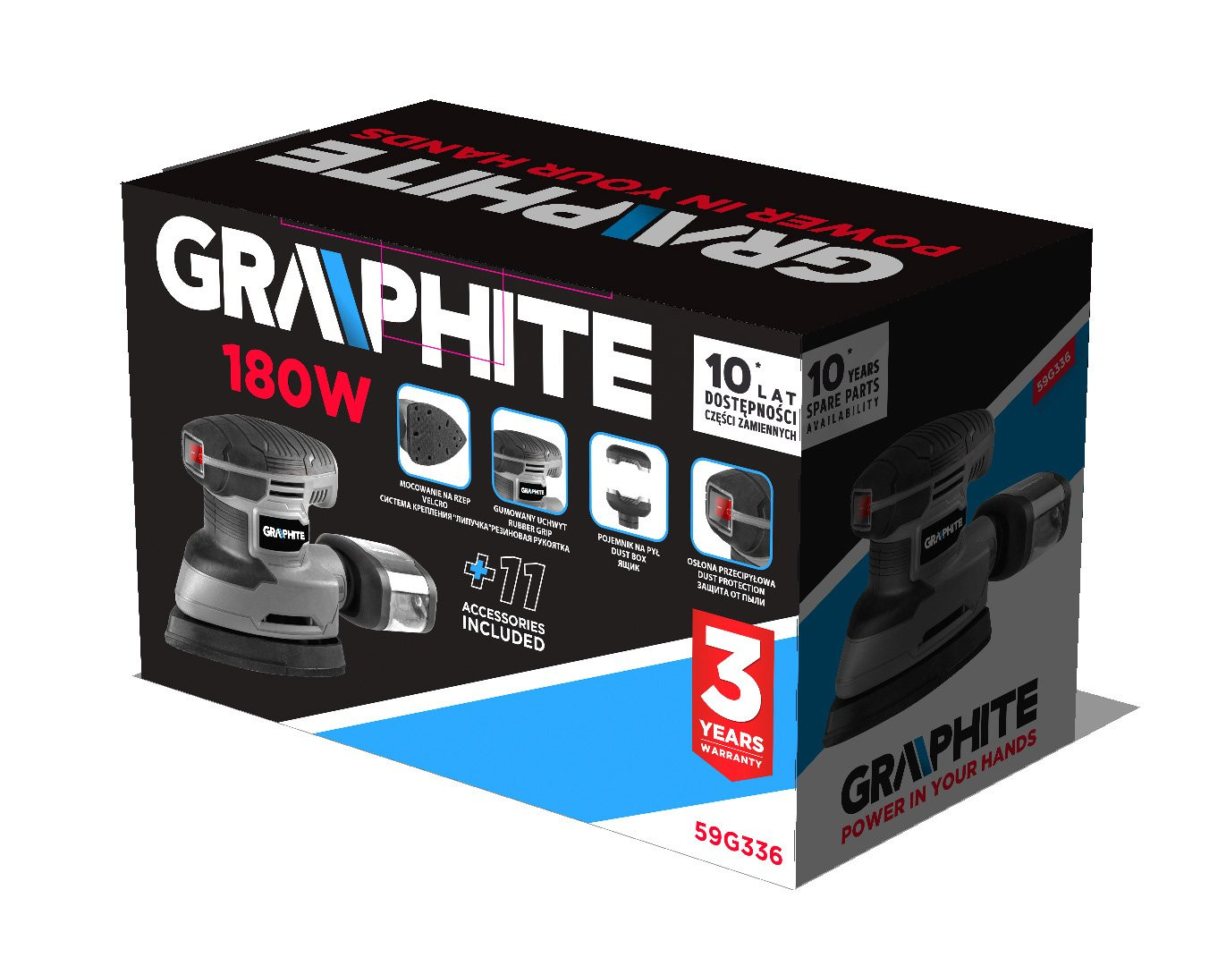 Szlifierka oscylacyjna delta 180 W, stopa 140 x 140 x 80 mm 59G336 marki GRAPHITE to narzędzie o mocy 180 W ze stopą w kształcie trójkąta o wymiarach 140 x 140 x 80 mm oraz kompatybilnym papierem ściernym 140 x 140 x 97 mm. Osiąga prędkość obrotową 13000 min⁻¹, a jego amplituda oscylacji wynosi 0,8 mm. W zestawie ze szlifierką oferowane są 3 stopy, papiery ścierne (9 sztuk) oraz króciec przyłączeniowy. Masa urządzenia wynosi 1 kg. Ten model szlifierki wyróżnia się antypoślizgową, wygodną w użytkowaniu rękojeścią oraz systemem odprowadzania pyłu. Posiada praktyczny przewód zasilający w gumowej powłoce o długości 3 m. To narzędzie niezbędne w szlifowaniu, polerowaniu oraz skutecznym usuwaniu rdzy lub farby.