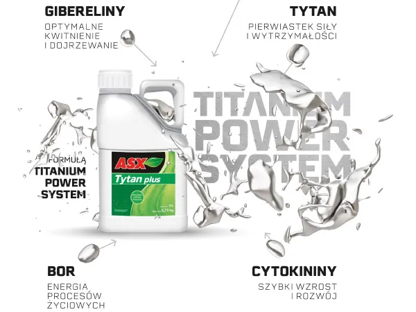 ASX Tytan Plus to płynny nawóz na niedobory tytanu i boru, odpowiedni do dolistnego nawożenia warzyw, sadów i upraw rolniczych. Nawóz ten zawiera fitohormony: cytokininy i gibereliny, co sprzyja wzrostowi, kwitnieniu i żywotności roślin.
