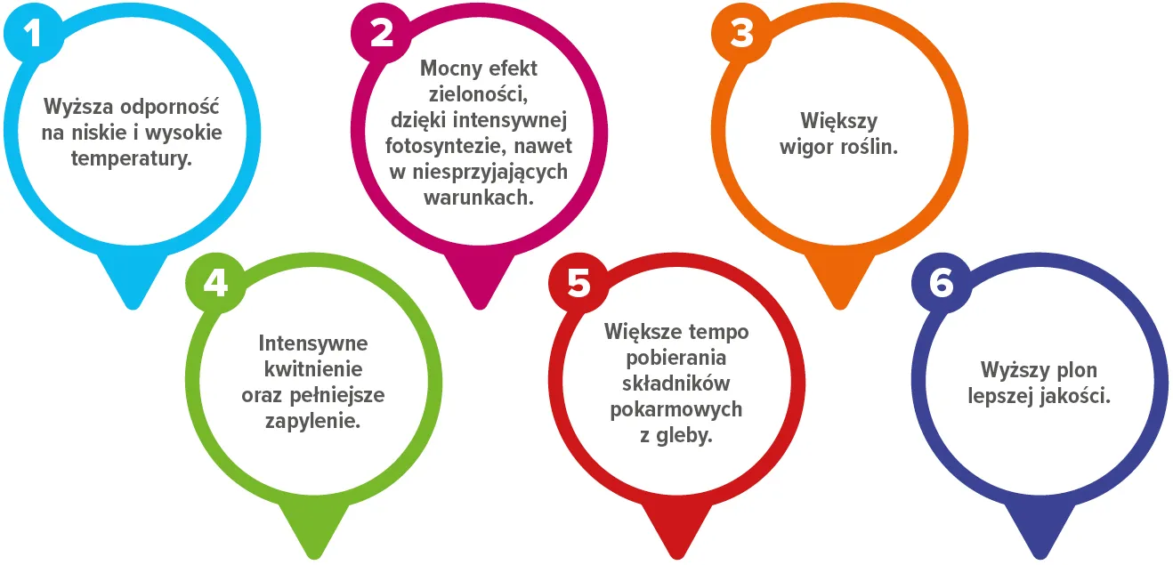 Korzysci: stymuluje syntezę chlorofilu, podnosi efektywność zapylania, wiązania owoców oraz fotosyntezy. Poprawia tolerancję roślin na sucho, zimno, upał i nadmiar wody. Stosowanie: dolistnie, w uprawach takich jak drzewa i krzewy owocowe, truskawki, maliny, pomidory, papryki, ogórki, warzywa cebulowe i kapustne, zboża, rzepak, kukurydza i ziemniaki.