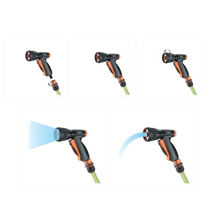 Pistolet prysznicowy z aeratorem, nierdzewnym sitkiem i napowietrzaczem oraz anatomiczną rękojeścią gumową i wygodnym przednim przyciskiem włączania i wyłączania. Pokrętło z tyłu reguluje siłę strumienia wody. Nakrętka zabezpieczająca wyłożona gumą dla ochrony przed uderzeniem, dla łatwego otwierania, kontroli i czyszczenia pistoletu. Perlator (napowietrzacz) zapewnia delikatny strumień wody zmieszanej z bąbelkami, idealny do podlewania delikatnych roślin doniczkowych umieszczonych np. na balkonie. Napowietrzacz jest wyjmowalny – w celu łatwego czyszczenia.