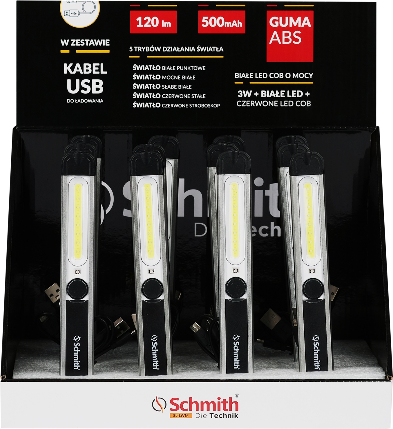 LATARKA WARSZTATOWA AKUMULATOROWA MINI 3W COB Symbol: SL-LWM Latarka warsztatowa Schmith Polska to produkt wyposażony w panel ledowy o mocy 120ml. Latarka uruchamia mocne i trwałe światło. Dzięki wbudowanemu magnesowi produkt jest łatwy do umiejscowienia w każdym dowolnym miejscu. Latarka w kształcie „paluszka” integruje w sobie trzy podstawowe funkcje: lampka podstawowa, wskaźnik laserowy oraz latarka kontrolna. – Materiał ABS. Produkt stworzony z gumy ABS niesie za sobą dużą udarność, twardość oraz odporność na zarysowania. – strumień światła 120lm – latarka emituje stabilny strumień światła 80lm przy zachowaniu wysokiego stopnia odwzorowania przyjemnego i naturalnego światła. – bateria 500mAh – bateria cechuje się dużą wytrzymałością co powoduje minimalne samorozładowanie. – 5 trybów działania światła – światło białe punktowe/ światło mocne białe/ światło słabe białe/ światło czerwone stałe/ światło czerwone stroboskopowe. – LED COB O MOCY 3W + CZEROWNE LED BOB – dzięki zastosowaniu LED COB produkt cechuje się wyższą intensywnością i większą jednolitością światła. Użycie tej technologii można znacznie zmniejszyć zużycie energii przez matrycę LED, dzięki czemu zostanie utrzymana stała moc światła. W zestawie znajduje się kabel USB do ładowania produktu. – Latarka warsztatowa jest łatwa w obsłudze, posiada jeden główny przycisk który możliwy jest do użytkowania nawet w rękawiczkach. – produkt zajmuje mało miejsca, łatwy do przechowywania.